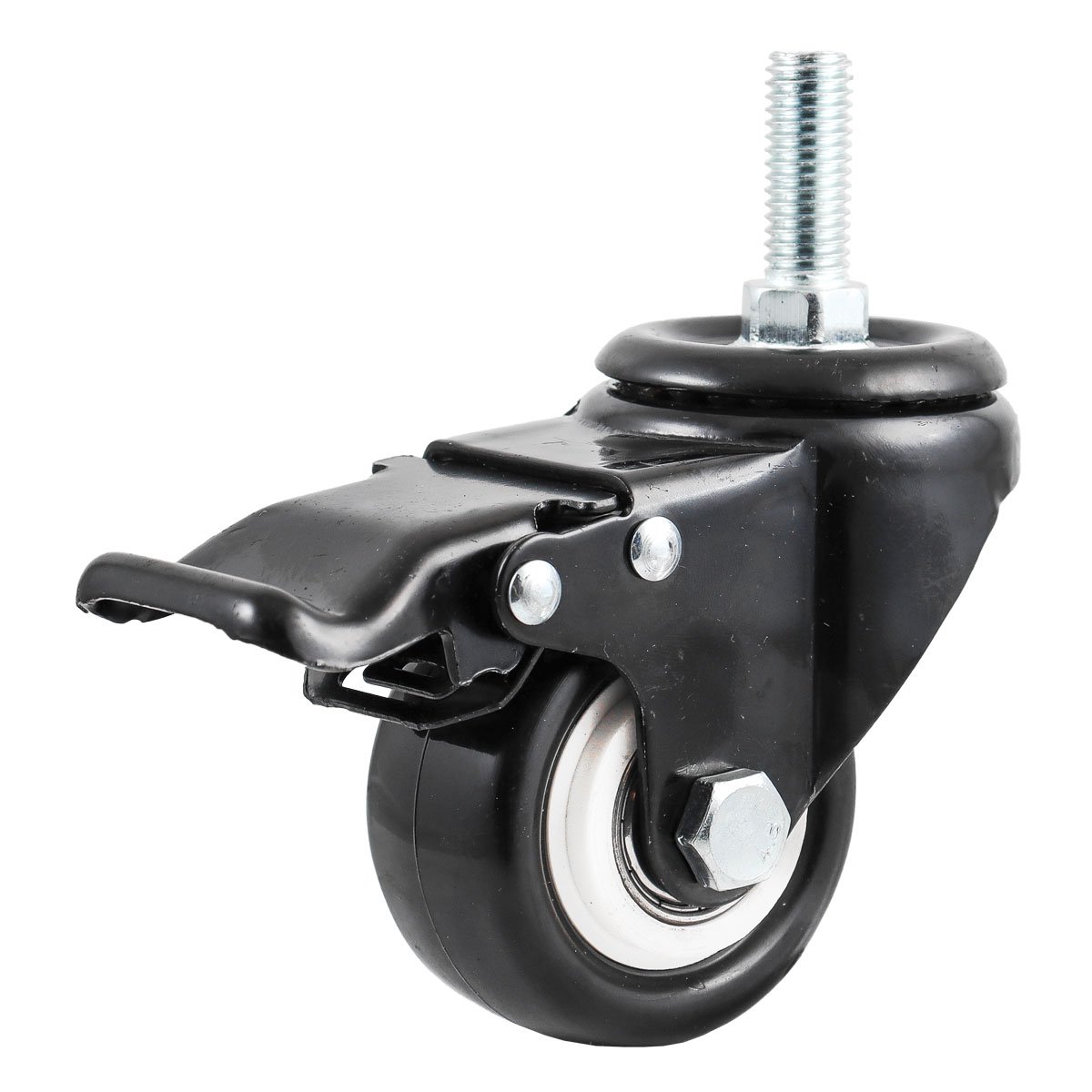 - Rodaja de PVC Negro Giratoria con Freno con Espiga Roscada 3″ (75x32mm).